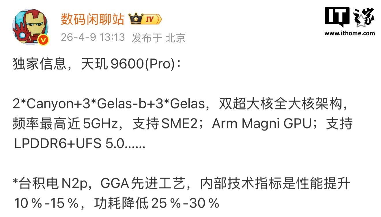 根据此前爆料,天玑 9600(Pro)采用 2*Canyon+3*Gelas-b+3*Gelas,双超大核全大核架构,频率最高近 5GHz,支持 SME2,配备 Arm Magni GPU,支持 LPDDR6+UFS 5.0 等。此外,其采用台积电 N2p,GGA 先进工艺,内部技术指标是性能提升 10%-15%,功耗降低 25%-30%。