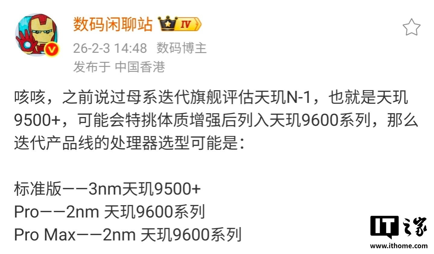IT之家注意到,该博主曾在今年 2 月表示,天玑 9500+ 处理器可能会特挑体质,增强后列入天玑 9600 系列,迭代产品线的处理器选型有望分成三杯: