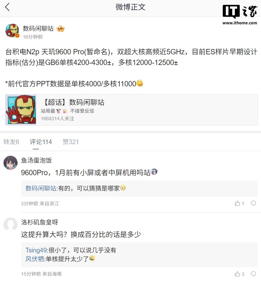 IT之家 4 月 17 日消息,博主 @数码闲聊站 今日曝光了联发科天玑 9600 Pro(暂定名)的跑分信息。